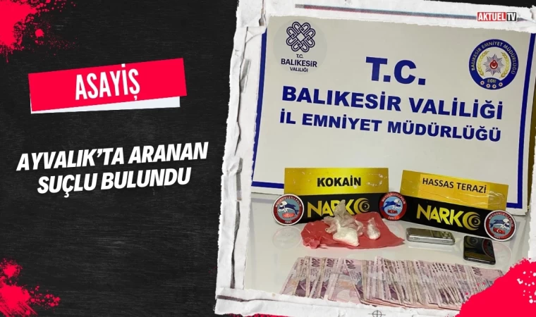Ayvalık'ta araçta bulunan ve Kasten Öldürme suçundan Aranma kaydı olduğu anlaşılan O.Ç.(23) isimli şahsın kaçmaya teşebbüs ettiği esnada boş araziye atmış olduğu çanta içerisinde; 1 adet Hassas Terazi, 33,44 gr Kokain Uyuşturucu Maddesi, 200’lük banknotlar halinde toplam 10.000 TL nakit para ele geçirildi.