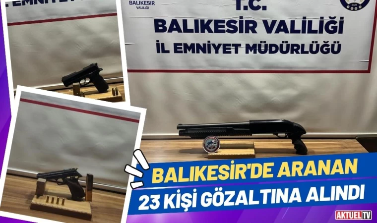 Balıkesir İl Emniyet Müdürlüğü Asayiş Şube Müdürlüğü ekipleri, genel güvenliği ve asayişi sağlamak amacıyla Altıeylül, Bandırma, Burhaniye, Edremit ve Susurluk ilçelerinde 'huzur' uygulaması yaptı. Yapılan çalışmalarda çeşitli suçlardan aranan 23 şahıs gözaltına alınırken, adli makamlara sevk edilen 11 şahıs tutuklandı. Yapılan aramalarda ise, 2 adet ruhsatsız tabanca ve 11 adet fişek ve 3 adet ruhsatsız tüfek ele geçirildi.
