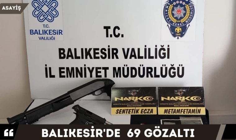 Balıkesir İl Emniyet Müdürlüğü Narkotik Suçlarla Mücadele Şube Müdürlüğü ekiplerinin il genelinde yaptıkları uyuşturucu operasyonlarında 69 şahıs gözaltına alındı. Yapılan aramalarda 666 adet sentetik ecza hap, 257,81 gram metamfetamin maddesi, 29,83 gram esrar maddesi, 18,92 gram bonzai maddesi, 8 kök kenevir bitkisi, 5 gram eroin maddesi, 5 adet ecstasy hap, 2 adet av tüfeği, 4 adet kartuş, 8 adet ruhsatsız tabanca ve 89 adet fişek, 1 adet hassas terazi ve uyuşturucu satışından elde edildiği değerlendirilen 22 bin 465 TL ele geçirildi. İşlemleri sonrası adli makamlara sevk edilen 6 şüpheli tutuklandı.