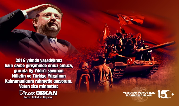 Karesi Belediye Başkanı Dinçer Orkan sosyal medya hesabından 15 Temmuz Darbe girişimi’yle ilgili mesaj paylaştı. Orkan yayımladığı mesajda, “2016 yılında yaşadığımız hain darbe girişiminde omuz omuza, gururla Ay Yıldız’ı savunan Milletin ve Türkiye Yüzyılının Kahramanlarını Rahmetle Anıyorum. Vatan size minnettar.” dedi.
