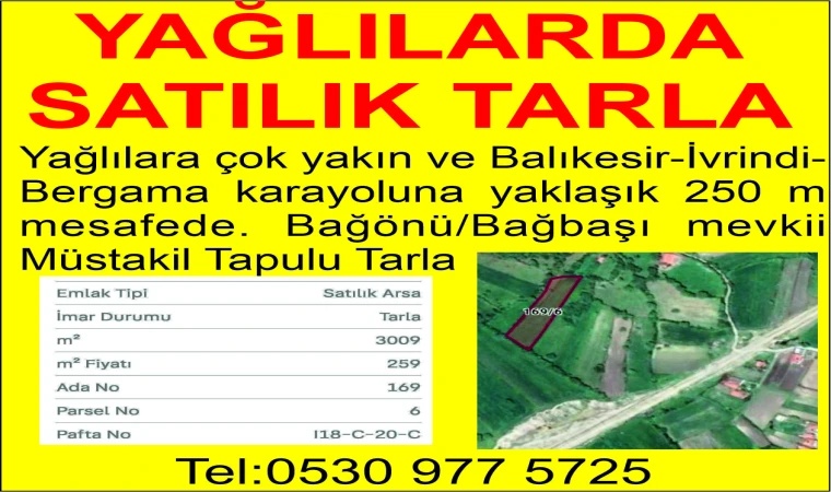 Yağlılara çok yakın ve Balıkesir-İvrindi-Bergama karayoluna yaklaşık 250 mmesafede. Bağönü/Bağbaşı mevkiiMüstakil Tapulu Tarla